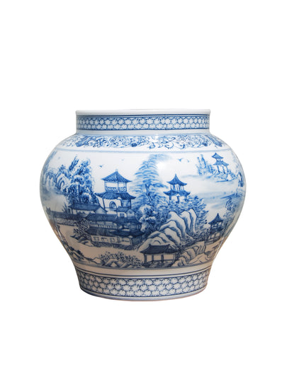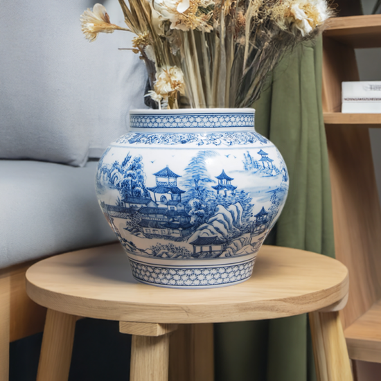 This vase blends classic Chinese artistry with contemporary appeal, showcasing pagodas, landscapes, and bridges in blue and white tones.