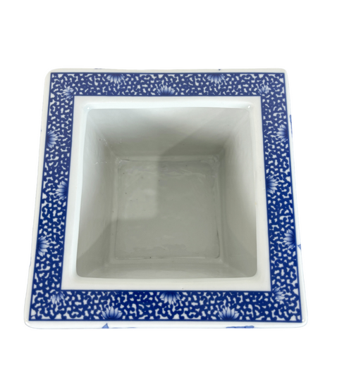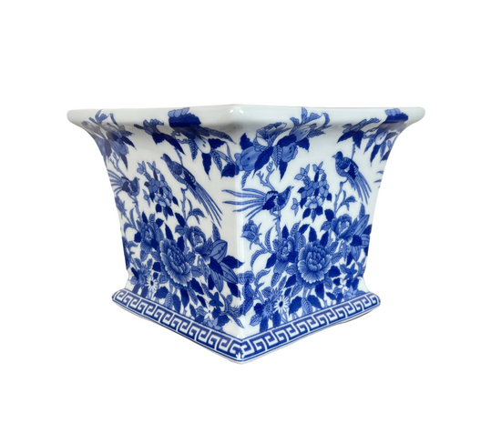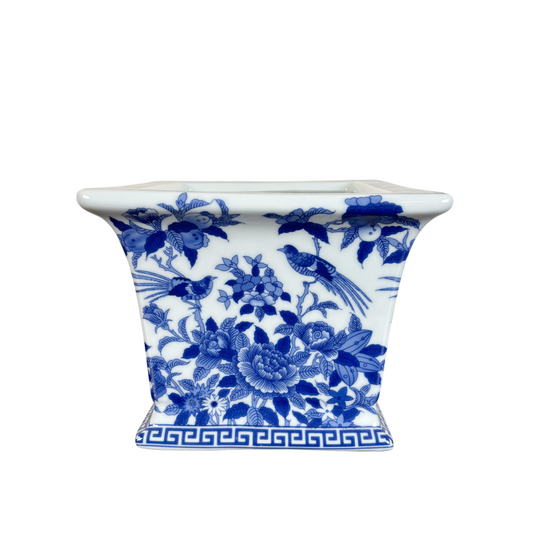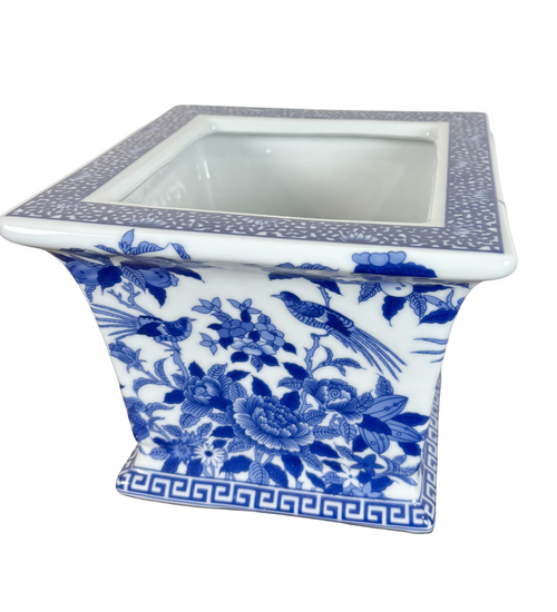 Blue and White Square Porcelain Bird and Floral Motif Planter