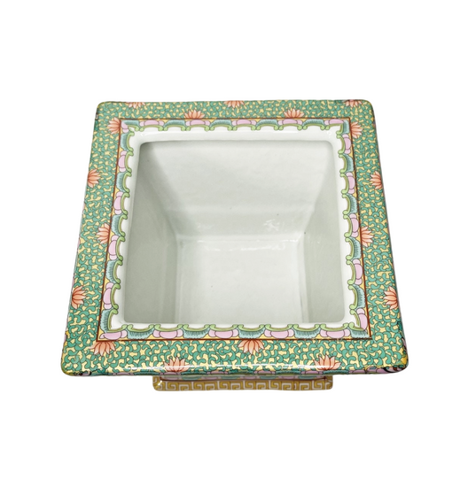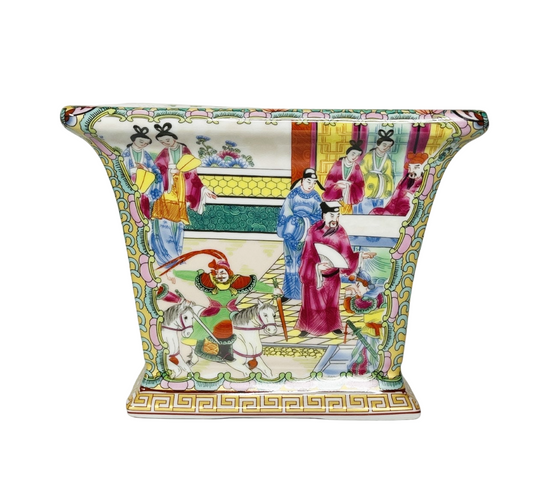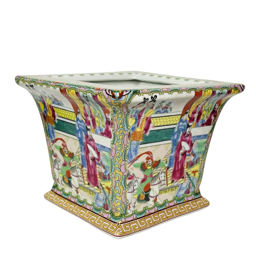 Famille Rose Porcelain Square Planter, intricately adorned with traditional scenes and vibrant hues. it's a timeless masterpiece blending history with modern elegance.